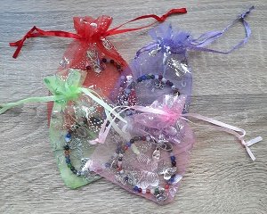 De armband wordt geleverd met drie schattige bedeltjes: een ovaalvormig bedeltje met het woord "Wish", een hartvormig bedeltje met de tekst "Made with love", en een lieflijke vlinder. Verpakt in een kleurrijk assorti organza zakje, voegt deze armband een vleugje magie toe aan elke gelegenheid.