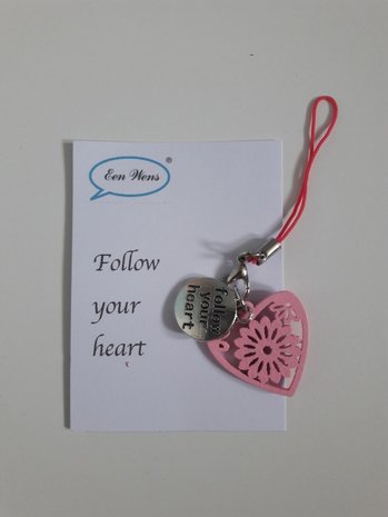 - Met hartje van hout en zilverkleurige hanger met de tekst: Follow your heart