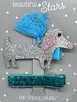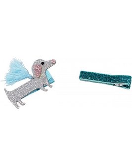 Deze glitterhaarclips zullen zeker een glimlach op het gezicht van je kleintje toveren, met een zilverkleurig glitterhondje, compleet met een schattig blauw kwastje. Met een afmeting van 6 x 2,5 cm is het hondje een opvallende en leuke toevoeging aan elke haarstijl.