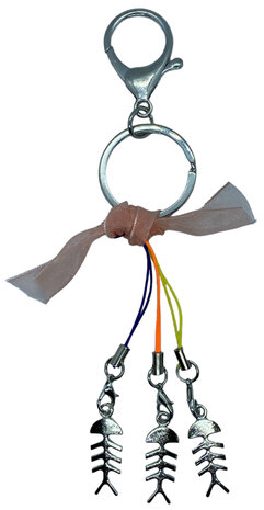 De tashanger, met een lengte van 15 cm, is voorzien van drie schattige visjes die je tas laten opvallen. De bijgevoegde giftcard, met een afmeting van 16 x 10 cm, is bedrukt met de leuke tekst: "Vis moet wel zwemmen, gauw een keertje wijnen?".