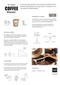 Ontdek de verrukkelijke smaak van onze biologische Arabica koffie, perfect voor twee heerlijke kopjes. Met trots biologisch en fair trade, biedt deze 20 gram koffie de ideale gelegenheid om samen te genieten van een kopje koffie. De wikkel draagt de uitnodigende boodschap: 'I like you, sharing a cup of coffee?'. Altijd en overal genieten van kwaliteit met onze innovatieve coffeebrewer. Dit unieke ontwerp, een combinatie van filterkoffie en cafetiere, geeft je een intense smaakervaring. Giet heet water direct over de koffie en laat deze 4 tot 6 minuten trekken voor een rijk, vol aroma.