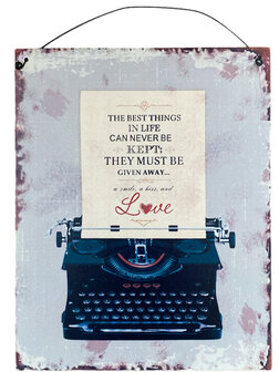 Met de wijze woorden 'The best things in life can never be kept; they must be given away... a smile, a kiss, and love' en de afbeelding van een ouderwetse typemachine, brengt dit bordje een gevoel van tijdloze schoonheid en diepgang in elke ruimte.