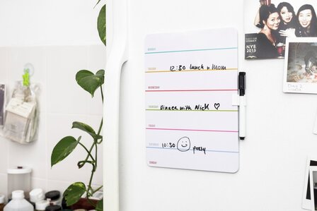 Plan overzichtelijk je hele week met deze handige weekplanner whiteboard. Deze magnetische weekplanner is perfect voor de koelkast of elk metalen oppervlak. Gebruik de bijgeleverde stift met ingebouwde wisser om eenvoudig je planning aan te passen. Een praktische en herbruikbare droog uitwisbare planner, ideaal als wekelijkse planner whiteboard.
