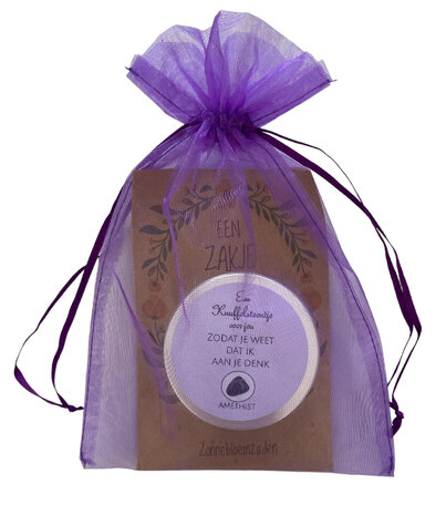 In het organza zakje vind je een zakje met zonnebloemzaden én een prachtig blikje met een knuffelsteentje van Amethist, gelegen op een zacht bedje van wol. De edelsteen helpt bij het verwerken van emoties en staat symbool voor rust, inzicht en bescherming.