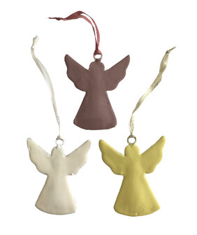 Deze set van 3 engelen is de perfecte toevoeging aan je kerstdecoratie. Gemaakt van metaal en in de kleuren wit, geel en paars, brengen deze metalen engelen set een feestelijke sfeer in je huis. De engelen zijn ideaal voor je kerstboom, als tafelversiering of voor het ophangen aan de muur.