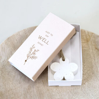 Verwen jezelf of iemand anders met ons bloemenzeepje "Just to Say Well Done" in een elegant doosje. Dit zeepje, dat aan een koordje zit, heeft een afmeting van 4,5 x 4,5 cm (excl. koordje) en is perfect als cadeau voor succes. De verpakking heeft de inspirerende tekst: “Just to say well done”, waardoor het een ideale keuze is om prestaties te vieren of iemand te bedanken. De afmeting van het doosje is 11 x 5,5 cm, perfect om cadeau te geven of om jezelf te verwennen.