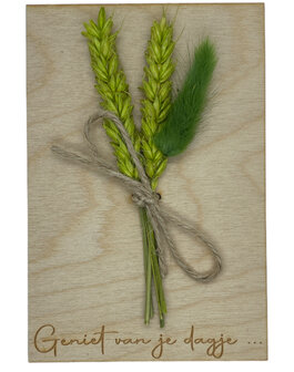 Deze wenskaart is gemaakt van hout en is voorzien van droogbloemen. De droogbloemen worden assorti geleverd, waardoor elke kaart uniek is. Op de kaart staat de tekst "Geniet van je dagje", waardoor het een perfecte manier is om iemand een fijne dag te wensen.